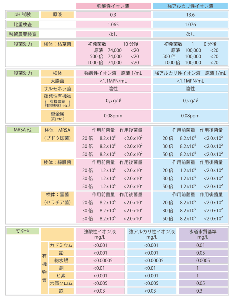 ◆Ph値『財団法人 食品環境検査協会』 ◆水質基準合格および成分分析表『岐阜県公衆衛生センター』 ◆残留塩素なし『北里環境化学センター』 ◆殺菌効力試験合格『北里環境化学センター』 ◆MRSA効力試験合格『社団法人 半田市医師会健康センター』 ◆MRSA耐性菌効力試験合格『株式会社 三菱ピーシーエル化学療法研究室』 ◆安全性試験合格『MEGA CRARE INC .Laboratry(米国FD認定検査機関)』 ◆急性毒性試験(LD-50)合格『藤田保険衛生大学検査センター』